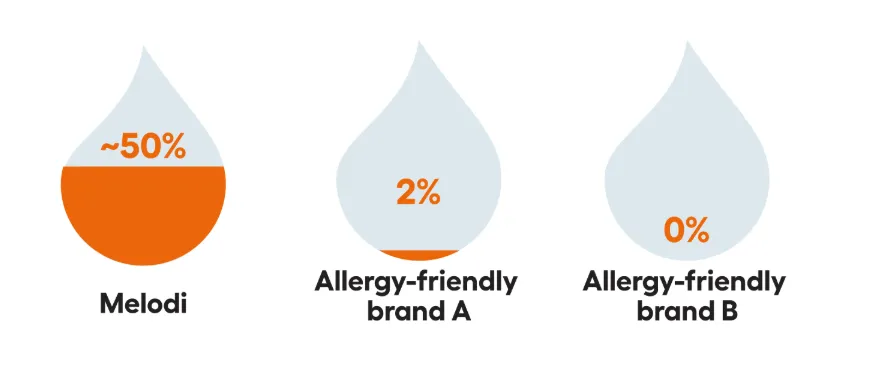 Carefully crafted with about 50% of its ingredients like those found in human milk. In contrast, traditional allergy friendly formulations contain less than 3% of these components, making our formula much closer to what nature intended. The percentage resemblance is measured by dry matter (g/L) (solids, nutrients).