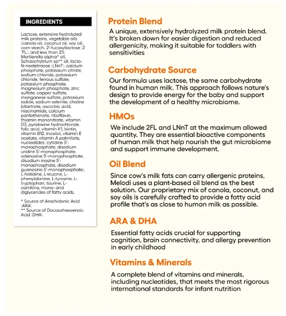 Harmony is built to set a new standard. Ahead of launching our infant formula, we are excited to offer our first product, Melodi, is a best-in-class allergy friendly toddler formula carefully crafted with the inspiration of human milk’s form and function.