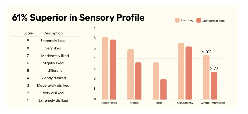 In addition, our human sensory study with 190 subjects comparing Melodi with market leaders shows 61% superiority in sensory profile (appearance, aroma, taste, consistency). The affective test was carried out through an acceptance test using a 9-point hedonic scale (1 - extremely disliked it to 9 - extremely liked it) for the attributes of appearance, aroma, flavor, consistency, and overall impression.